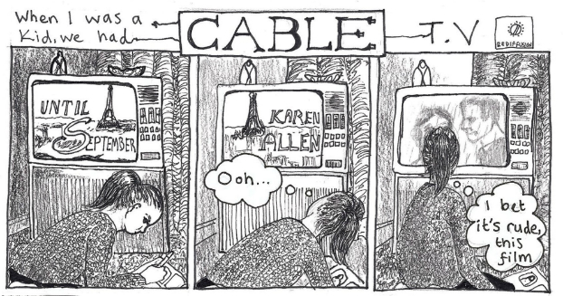 It will come as no surprise, though, that the two show-stealing entries come from creators who have been regular faces in this column over the last couple of years. Wallis Eates once again displays just why she is one of the most vitally important and perceptive practitioners of autobiographical comics in the UK at the moment in ‘When I Was a Kid We Had Cable TV’ (above). A recognisable account of childhood curiosity with the adult world, it cleverly exploits the standards of the form with the most inventive manipulation of thought bubbles, speech balloons and colour to expand its sense of a child’s eye view of reality. Visual characterisation here is also subtle yet astonishingly expressive. Outstanding work from an artist who deserves far, far greater exposure.
