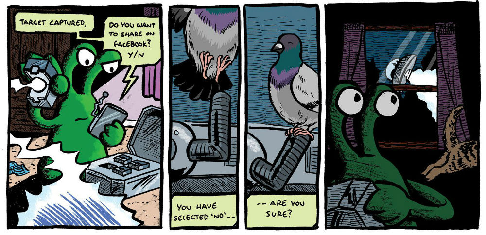 Elsewhere Evan Stamps provides a rhythmic and touching wordless story of a cat burglar and a home for unwanted children (see top banner image) while Rica March makes us root for true love to win in a delicately crafted observational piece. Elias Bevan is another creator to play with the possibilities of the page in a very neat piece of meta subversion and Alex Hahn has more frantic fun with his alien Blop character (above).