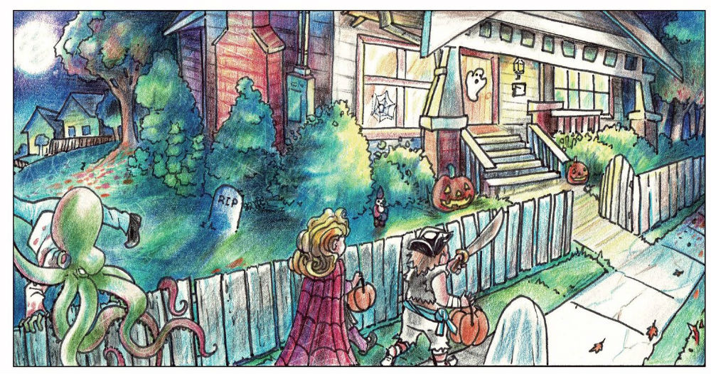 Elizabeth Querstret has been expanding her comics repertoire of late with material that has shifted away significantly from her spontaneously scribbled and refreshingly open diary comics. ‘Sneaky Critters’ is an amusing fable of anthropomorphised woodland life with inviting artwork that would surely appeal to a younger reader. K. Ly R’s ‘Sneaking Treats’ (below) also has an allure for an all-ages audience, albeit a more sinister one in a Halloween shocker that makes atmospheric use of autumnal colours. And those who remember a certain divisive early issue of John Byrne’s Alpha Flight will no doubt smile at Alex Tawns’ cheeky ‘Spot the Ninja!’.