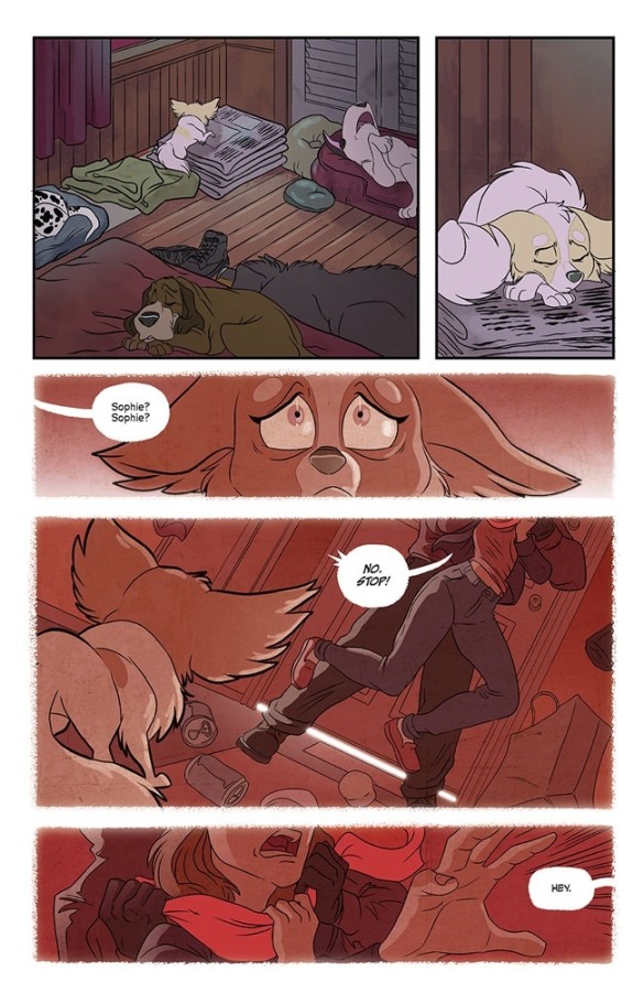 Where the story perhaps falters on occasion is that so much is made of the idea of the dogs’ limited ability to remember things outside of the immediacy of the moment which in their anthropmorphised states doesn’t always remain consistently defined depending on the needs of the plot. Still, the first book/run is a taut chiller made all the more atmospheric for our perspective of events being mostly seen at a dog’s eye view of the world, particularly in relation to the master whose presence is all the more ominous/menacing for the fact that for much of the story his face and/or upper body are just off panel. Brad Simpson’s colour choices are similarly important in communicating the forbidding tone and mood of the piece.