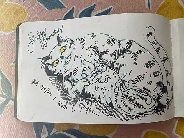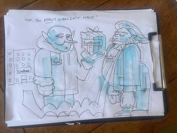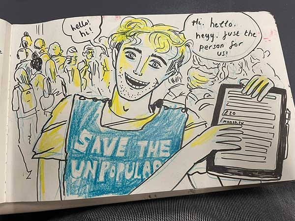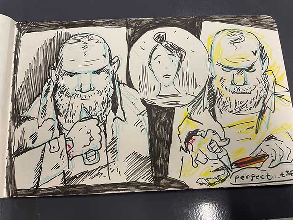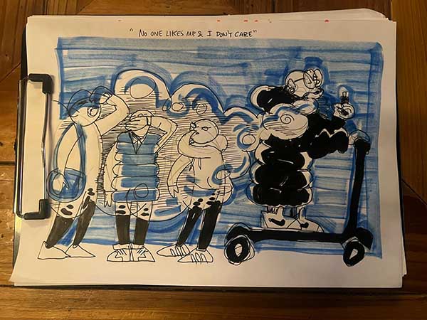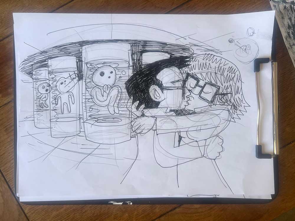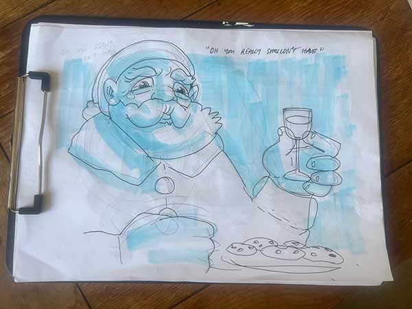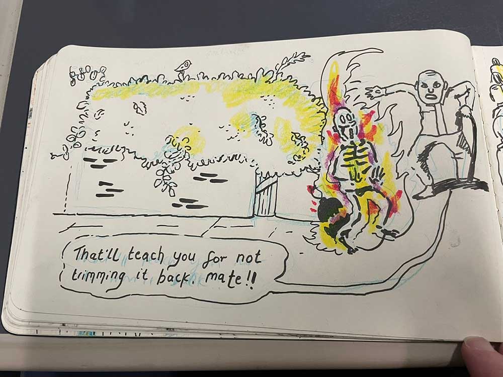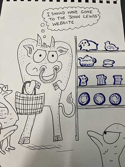 Last year the Gosh! Comics and Broken Frontier Drink and Draw – an event that has been running in multiple versions online and in-person since the summer of 2015 – returned to real world meet-ups in the Royal George pub in Soho, London. The evening involves two guest artists and a cartoonist-in-residence (the incomparable Mark Stafford) who set three drawing theme challenges for attendees to interpret over the course of the evening. A format I came up with 11 years ago and which has served us well over the years.