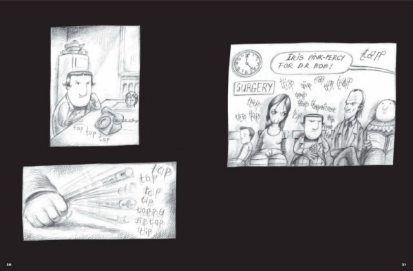 Ball conveys the experiences of her on-page avatar with a compelling use of comics’ visual language. In the key diagnosis scenes Iris shrinks to child-like proportions as the reality of the situation hits home and in another deeply affecting page the single word “mastectomy” hangs ominously over her as her visage becomes a completely blank void bar the inescapable presence of a pair of desperate, plaintive eyes.