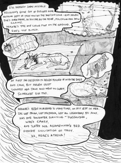 Carson and Bruno employ a cast of largely dog and bird versions of the play’s characters, making use of that ironic comics convention of giving us anthropomorphic animals that we connect with more intimately despite them being visually one step removed from our own conception of humanity. Carson’s text blends modern idiom with more lyrical language, something echoed in Bruno’s loose and lively art which juxtaposes modern iconography with classical allusion. In the process they bring the thematic heart of the play to the foreground, underlining the loss not just of individual lives but also of a way of life and a culture, and the impact that war has not simply on the vanquished but also on the victors.