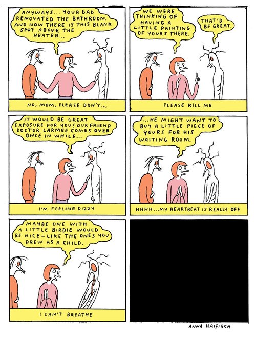 Anna Haifisch’s The Artist has been collected by 2015 Broken Frontier Award-nominated Breakdown Press, those fine purveyors of cutting edge comics. The book is described by Breakdown in the following terms: “Haifisch’s idiosyncratic, episodic comic chronicles the experiences of a young artist in his formative years, satirising the exclusive, ephemeral and frequently absurd world of fine art. Plagued by doubts and anxiety, the artist is confronted with constant setbacks punctuated by occasional, surprising glimpses of recognition.”