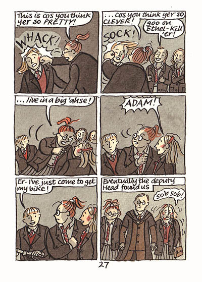 Adam is victimised by a boy called Peter, who we see chalking up “Adam is Queen of the Poofs” on the class blackboard. Teresa gets bashed up by a girl called Ethel – “This is cos you think yer so pretty! Whack! …Cos you think yer so clever! Sock!… Live in a big ‘ahse!” But the next morning, when she turns up covered in bruises, “All Ethel said was ‘O right me old prune?’ – and never hit me again”.