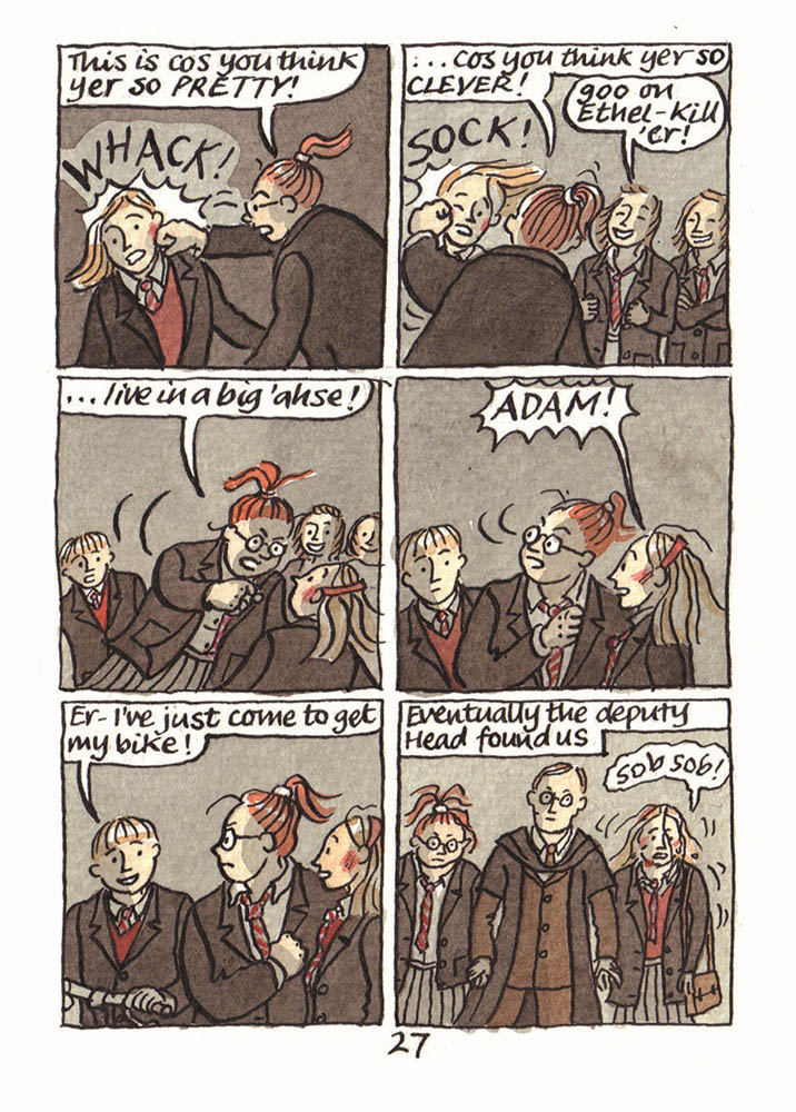 Adam is victimised by a boy called Peter, who we see chalking up “Adam is Queen of the Poofs” on the class blackboard. Teresa gets bashed up by a girl called Ethel – “This is cos you think yer so pretty! Whack! …Cos you think yer so clever! Sock!… Live in a big ‘ahse!” But the next morning, when she turns up covered in bruises, “All Ethel said was ‘O right me old prune?’ – and never hit me again”.