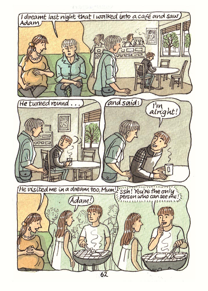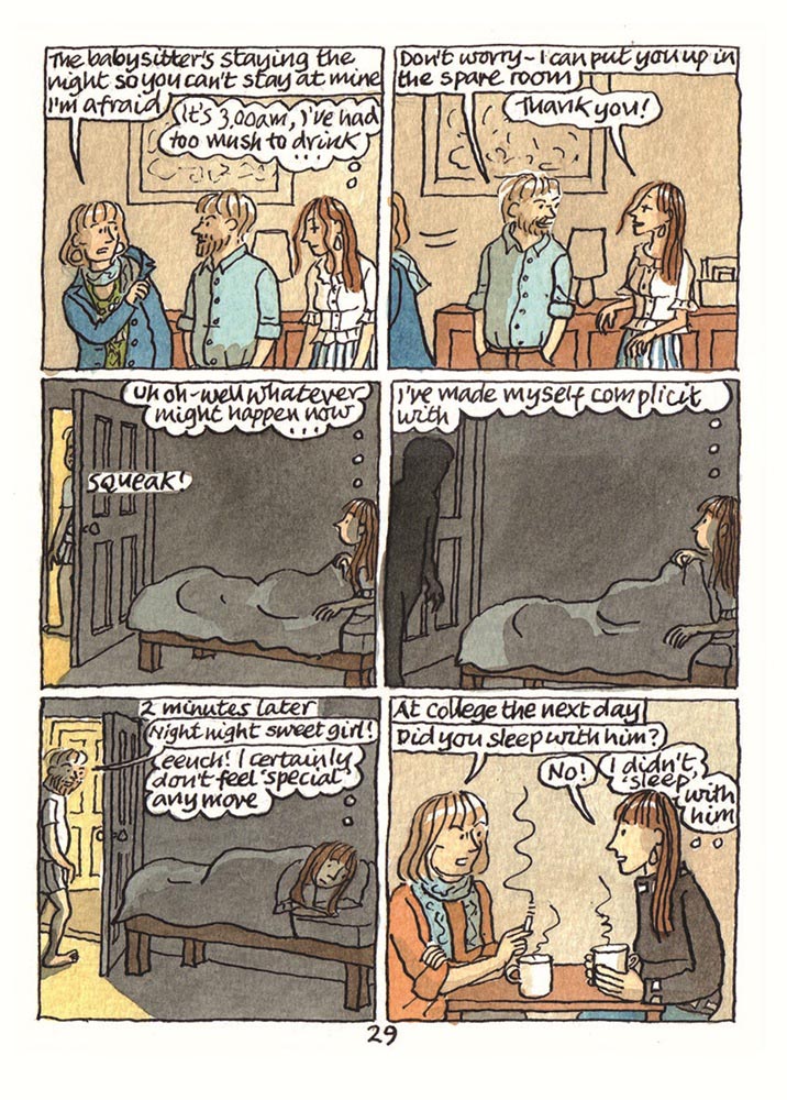 It’s a very feminine book. It’s beautifully drawn, in a style reminiscent of both Posy Simmonds and Raymond Briggs. It’s about families and friendships, and the ways in which life plays out through them. It contains so many friends and relations that it can be a bit difficult to keep track of them at times, but its complexity in this regard feels like the complexity of real life. It’s about babies growing up and becoming parents themselves, and then the pattern repeating itself. It deals with old age and death – we see both of Robertson’s parents getting old and dying – but it finishes on a note of renewal and optimism. Highly recommended.