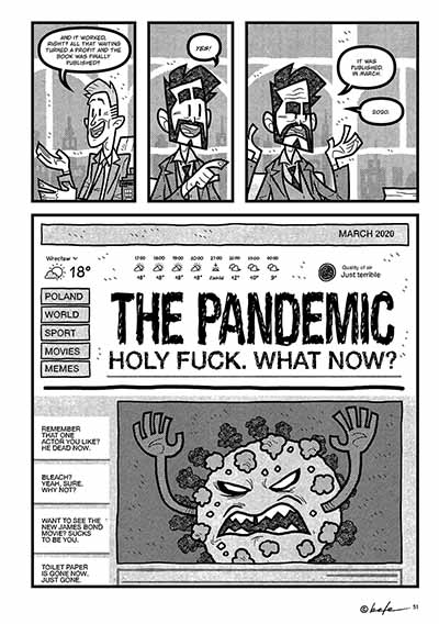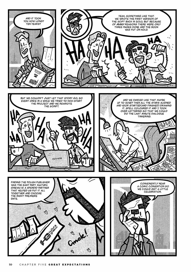 There’s also a fascinating two-pager on Sienicki‘s day job at the time lettering Polish-language translations of English and European comics. The highlight of this first book may be the final chapter which deals with the trials and travails of the Rycerz Janek graphic novel Sienicki co-wrote being published and translated into English by Behemoth (now Sumerian) in the States as Knight Janek. This story is particularly notable for the bittersweet tone Sienicki balances between the excitement of getting a graphic novel published and the crushing blow of the pandemic shutting down all avenues to promote and share the book.