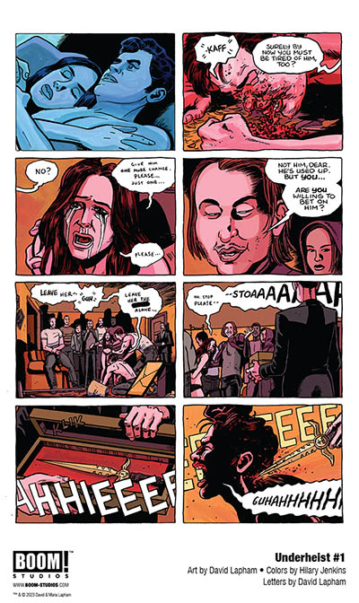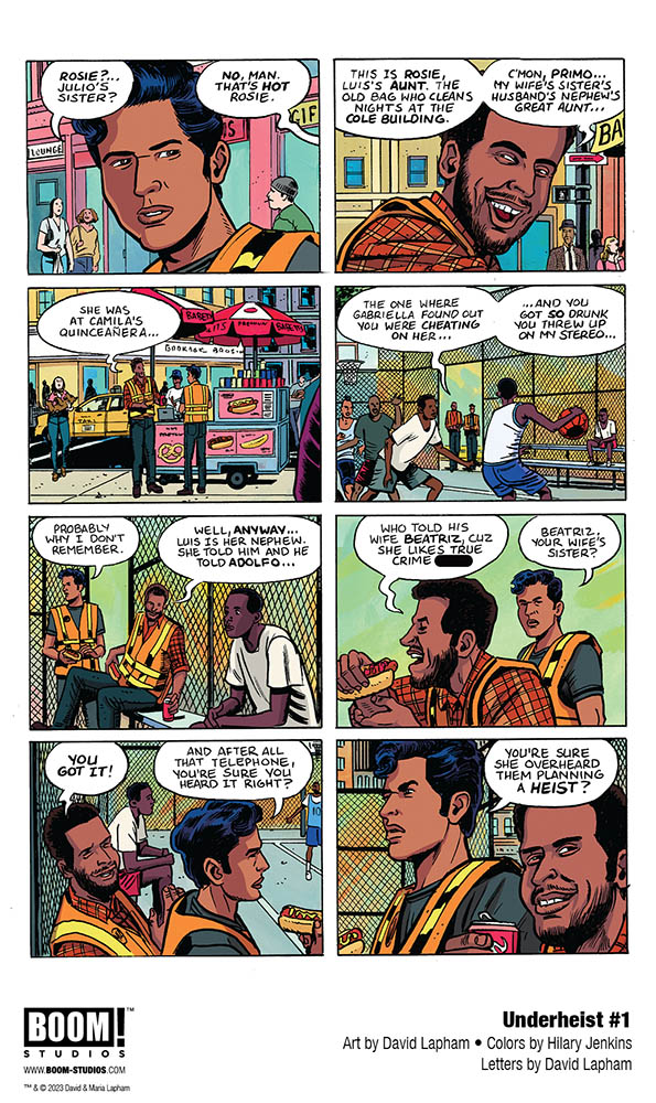 BOOM! Studios today revealed a first look at UNDERHEIST #1. The hit Stray Bullets creative team of David & Maria Lapham, along with colorist Hilary Jenkins (Grass Kings), brings a hellish new hardboiled heist series in UNDERHEIST, available December 2023.