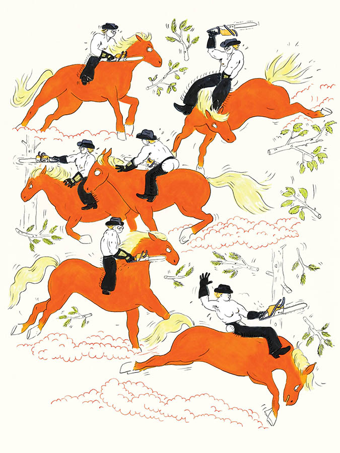 The biography on Burwash’s website describes their work as ‘both imaginative and rooted in their lived experience, including cabin building, forest stewarding, motorcycling and crewing on a fishing vessel.’ That comes through in the art, and the authenticity with which Drew rides a bike, cuts down trees, or sharpens a chainsaw, all while subverting the male fantasy of life as a cowboy.