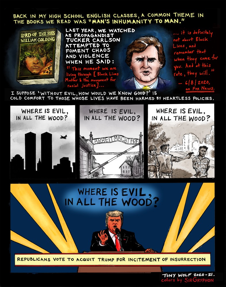 We have read many essays by now detailing the countless atrocities of the Trump administration and the Republican party. (Even now, the Republicans seek to curb voting rights in the USA.) My aim in this piece was to attempt to present a new angle on all this, and to emphasize some examples that we haven’t already seen listed many times before. Last week revealed that Trump’s own former Chief of Staff John Kelly attests that Trump insisted: “Well, Hitler did a lot of good things.” The final sequence in my essay comic asks the reader to consider that the Republicans have consistently enabled (and let off the hook) a man who is absolutely the kind of historical figure that tends to nudge forward horrible, mass destructive events.