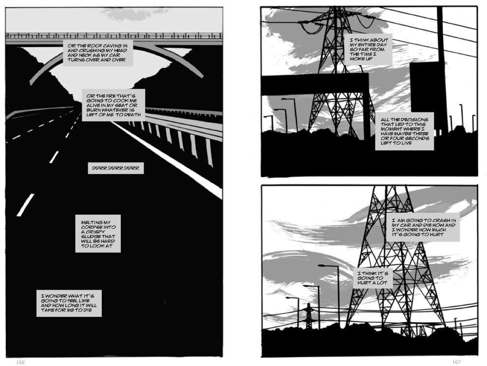 If you’ve ever heard Woodrow speak at an event then you will be aware of his passion for work that speaks the pure language of comics and uses storytelling methods unique to the form. That’s self-evident in his own output. Woodrow was the creator who brought us Rumble Strip from Myriad Editions, a graphic exploration that both examined and asked difficult questions about our obsessional dependence on cars. We recently revisited the book here at Broken Frontier as part of our ‘Myriad Week‘ celebration.