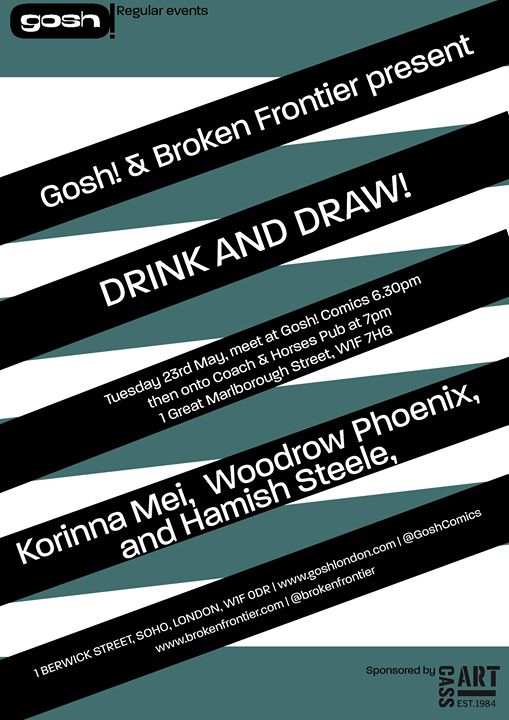 Another month, another guest-artist filled D&D! The Gosh! Comics and Broken Frontier Drink and Draw is back this coming Tuesday May 23rd with another top trio of artistic talent in Korinna Mei, Woodrow Phoenix and Hamish Steele.