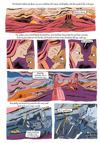 The story begins with a prologue, giving some context to the narrative to follow; the wizard Merlin is worried that magic will soon be lost from the land, and the gateway between our two worlds will close forever. However, his magic mirror tells him that someone will restore the balance – but it isn’t Merlin himself. It is, in fact, a woman (gasp!). Here our story begins: meet Young Hag, recently initiated into her family’s coven of witches. Despite having some powers, like brewing potions, these witches don’t have any real magic – magic has been eradicated from the land by the Lady of the Lake, after being betrayed by her apprentice. This twisted tale only becomes more convoluted from there, with her grandmother, Old Crone, revealing herself as King Arthur’s older sister Morgan; a controversial figure in Arthurian legend, Morgan is a powerful sorceress who, depending on the text, is either Arthur’s protector or his enemy. As her role in the past narrative slowly unrolls in the present, Young Hag must decide for herself where her destiny truly lies, as tragedy strikes and a gate between the two worlds appears to open.
